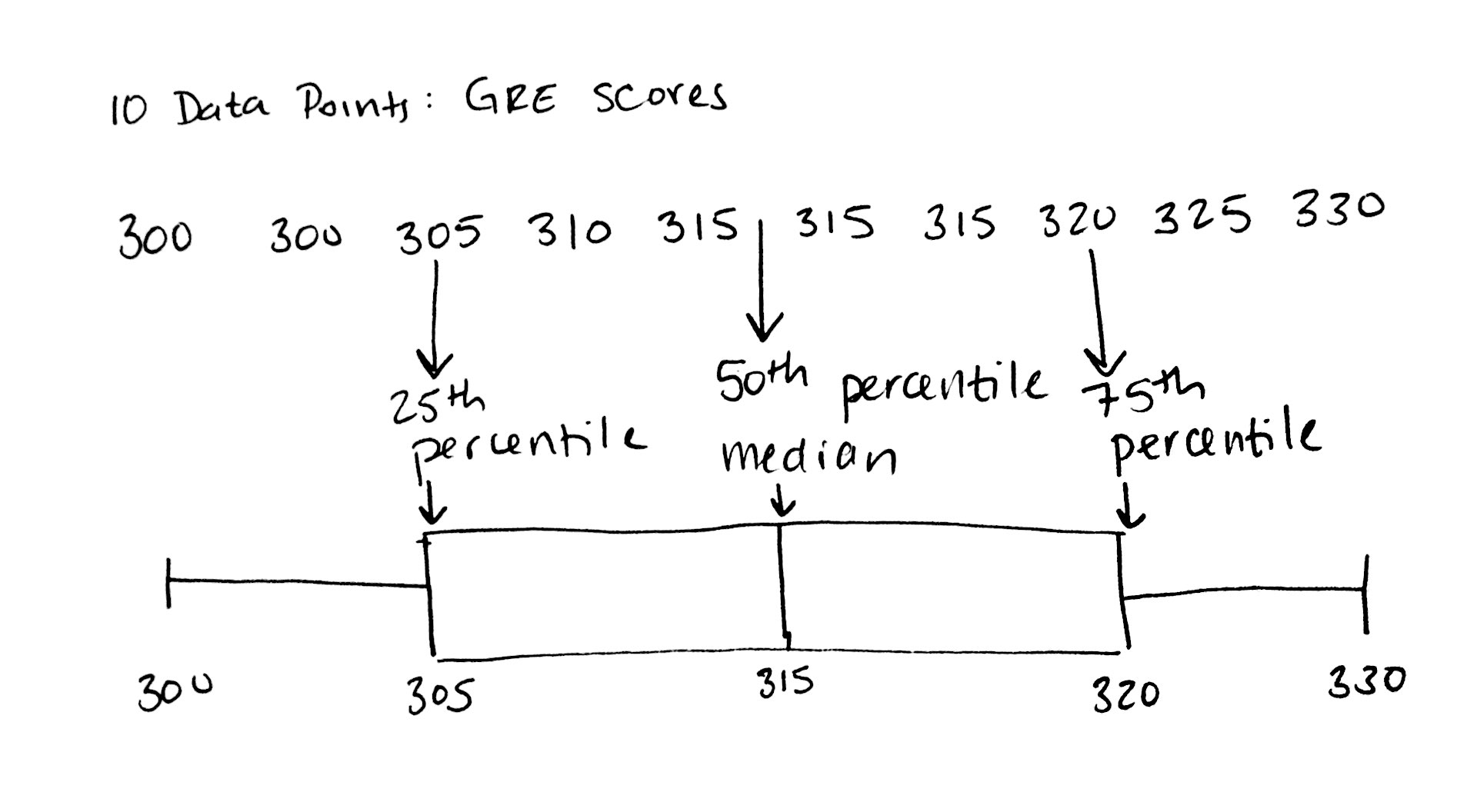 When you see a question relating to percentiles, quartiles/interquartile ranges, or boxplots, imagine that you take all your data points and line them up from smallest (on the left) to largest (on the right). Find the middle point, which has an equal number of data points on either side. This is your 50th percentile, also known as the median or middle quartile. Next, find the middle point in the bottom half of the data set: this is your 25th percentile (lower quartile). Finally, find the middle point of the upper half of the data set: this is your 75th percentile (upper quartile). We can see this illustrated in the following picture: